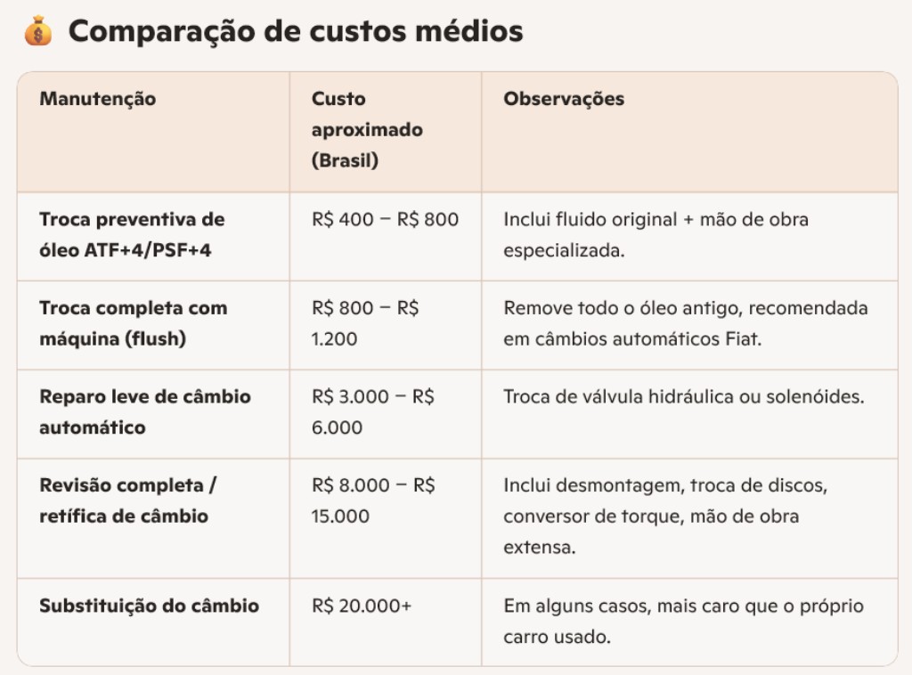 A troca do óleo de câmbio automático Fiat que utiliza o lubrificante Mopar ATF+4/PSF+4 deve ser feita em média a cada 40.000 km ou 2 a 3 anos, dependendo do uso. Em condições severas (trânsito intenso, subidas frequentes, reboque de carga), o intervalo pode ser menor. Ignorar a troca pode causar superaquecimento e desgaste prematuro do câmbio.