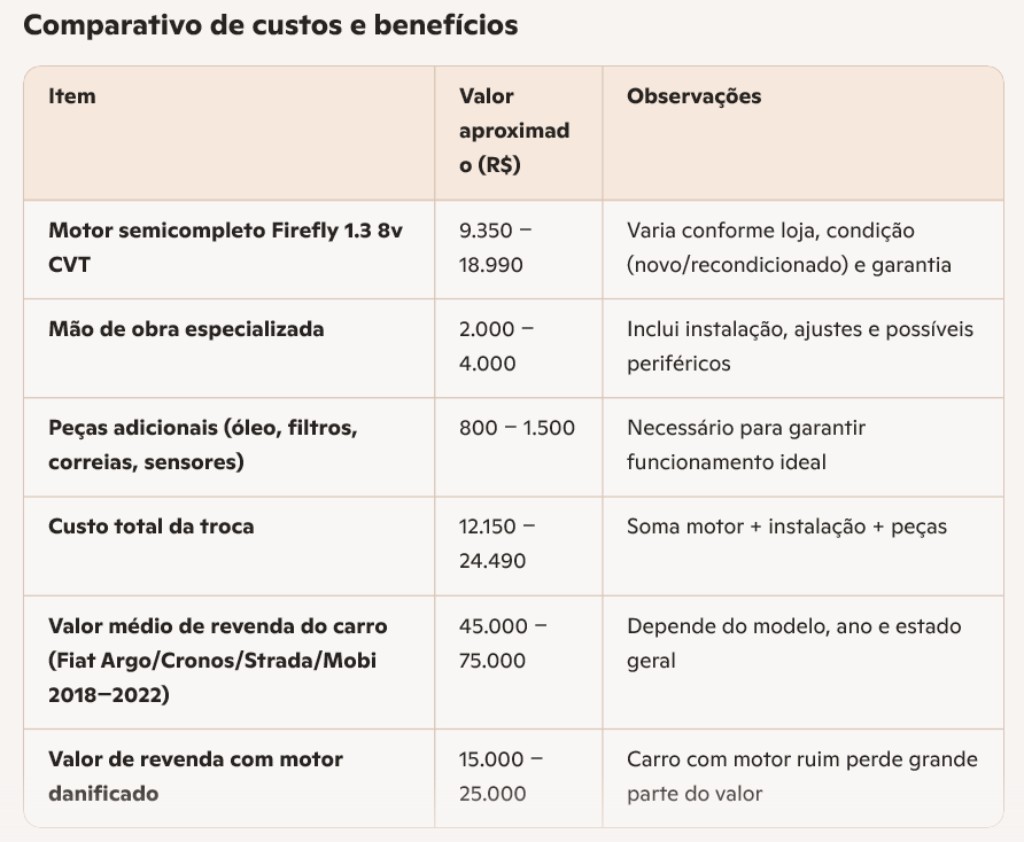 Para decidir se vale a pena comprar um motor semicompleto Firefly 1.3 8v com câmbio CVT da Fiat, é importante avaliar alguns pontos práticos: